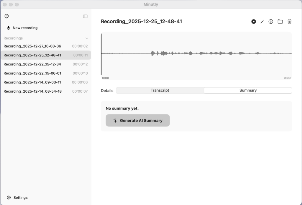 Connect your own AssemblyAI and OpenAI keys. You pay providers directly at their rates—we never touch your bill. Use free local transcription (Apple) or premium APIs. Your choice, your control, total transparency.